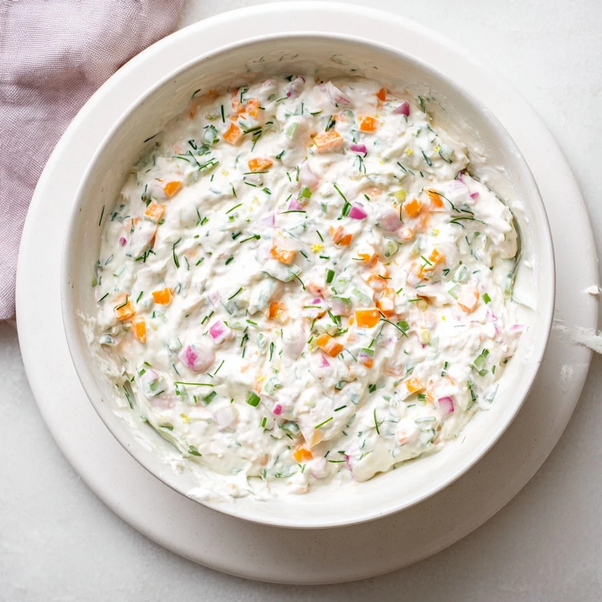 This indulgent creamy dip combines a rich blend of cream cheese, sour cream, and mayonnaise with fresh herbs like chives, dill, and parsley. The addition of finely grated carrot, diced cucumber, and radishes adds texture and vibrant color. Bright lemon zest and juice elevate the flavors, making it perfect for spring gatherings. Simply mix, chill for 30 minutes to let flavors meld, and serve with your favorite dippers.