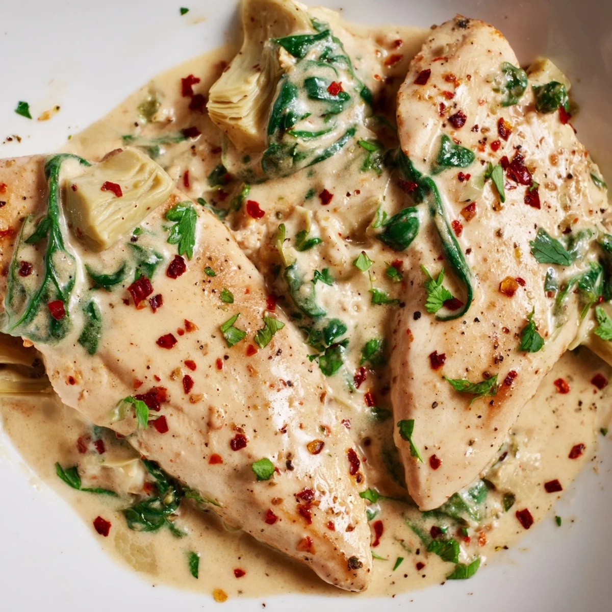 This skillet dinner features golden chicken breasts simmered in a luxurious garlic and Parmesan cream sauce. Fresh spinach and tender artichoke hearts add texture and flavor, creating a comforting low-carb meal. Ready in just 40 minutes, it is an effortless option for a satisfying and hearty dinner.