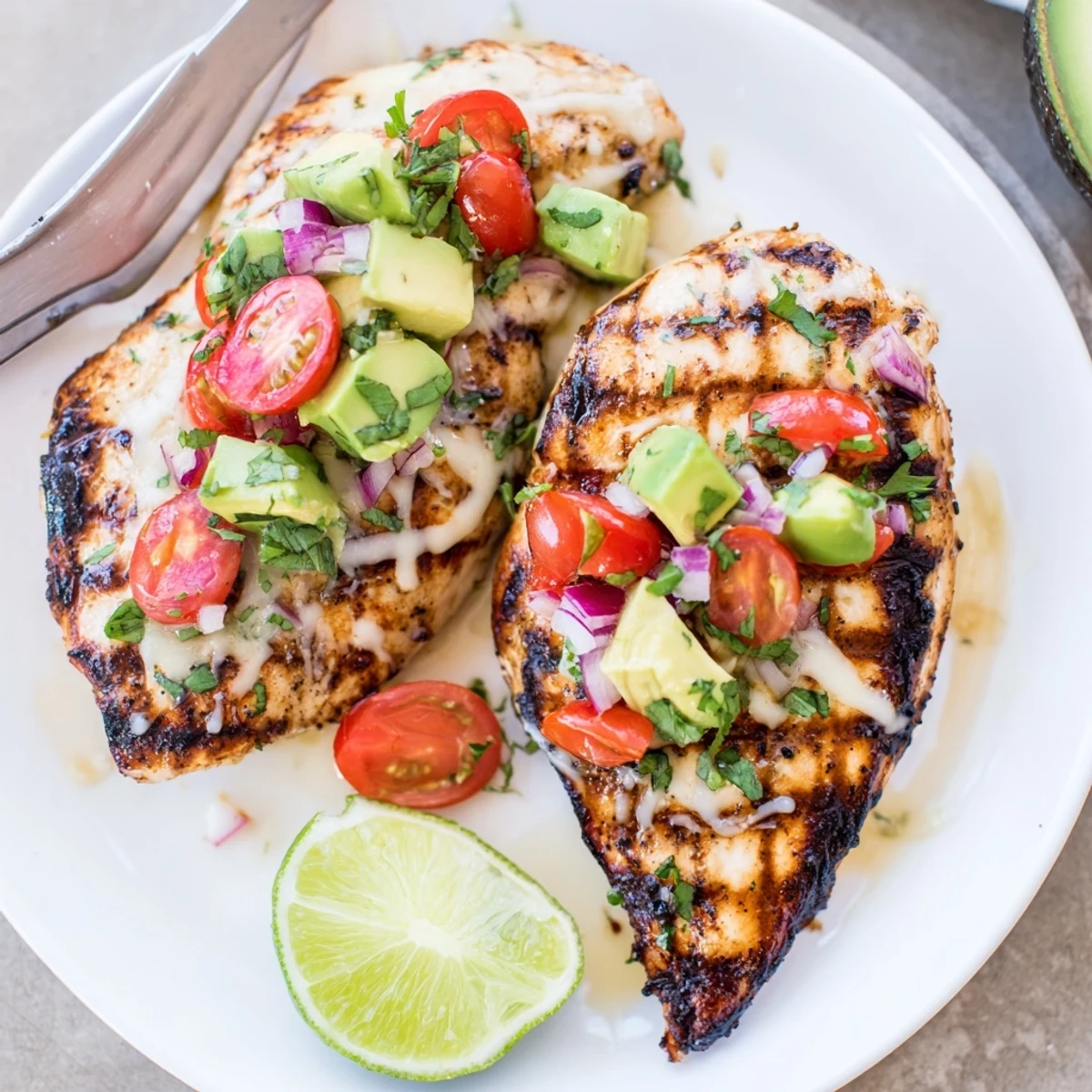 Bright, lime-forward chicken is whisked with olive oil, garlic, honey and Tex‑Mex spices, then marinated briefly and grilled until juicy. Top with diced avocado, cherry tomatoes, red onion and cilantro; finish with a squeeze of lime and optional melted Monterey Jack. Rest the breasts before slicing, and add jalapeño or crushed red pepper for heat. Ready in about 40 minutes for four.