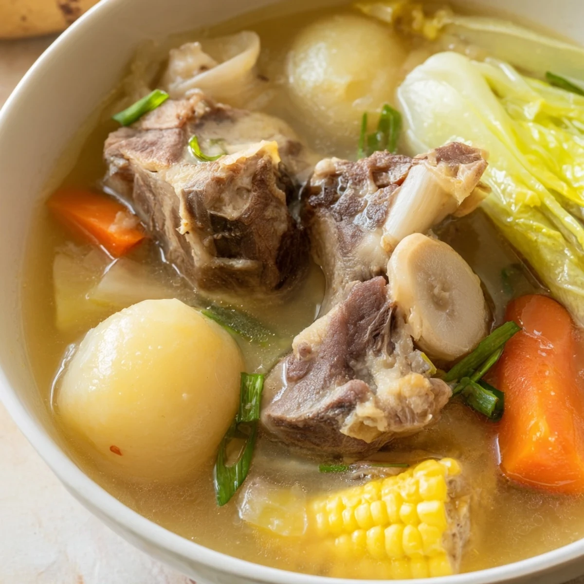 This traditional Filipino soup transforms beef shank and bone marrow into a deeply flavorful broth through slow simmering. The result is tender, fall-apart meat and rich, gelatinous marrow that creates a luxurious mouthfeel. Hearty vegetables like corn, potatoes, carrots, and napa cabbage add substance and sweetness, while fish sauce and peppercorns provide authentic Filipino depth. Serve with steamed jasmine rice and fresh calamansi for a complete comfort meal that's perfect for cool weather or family gatherings.
