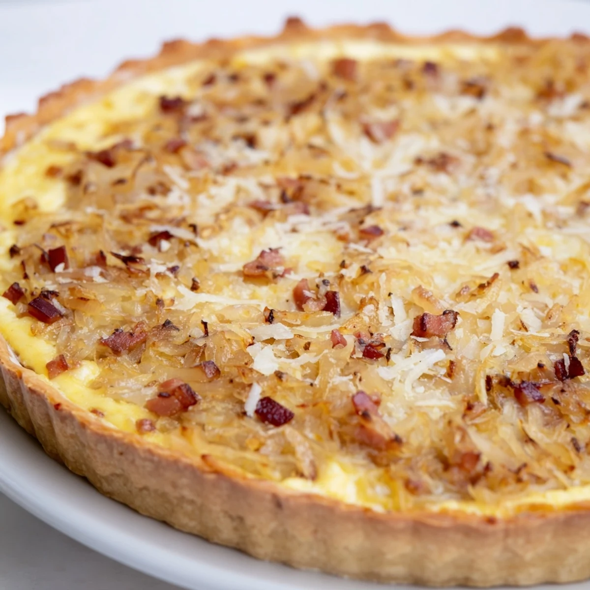 German onion pie typically includes bacon and a custard filling made with cream, milk, and eggs, while the French version often uses just cream or sour cream. The German version also features caraway seeds and nutmeg, adding distinctive aromatic notes that set it apart from its French counterpart.