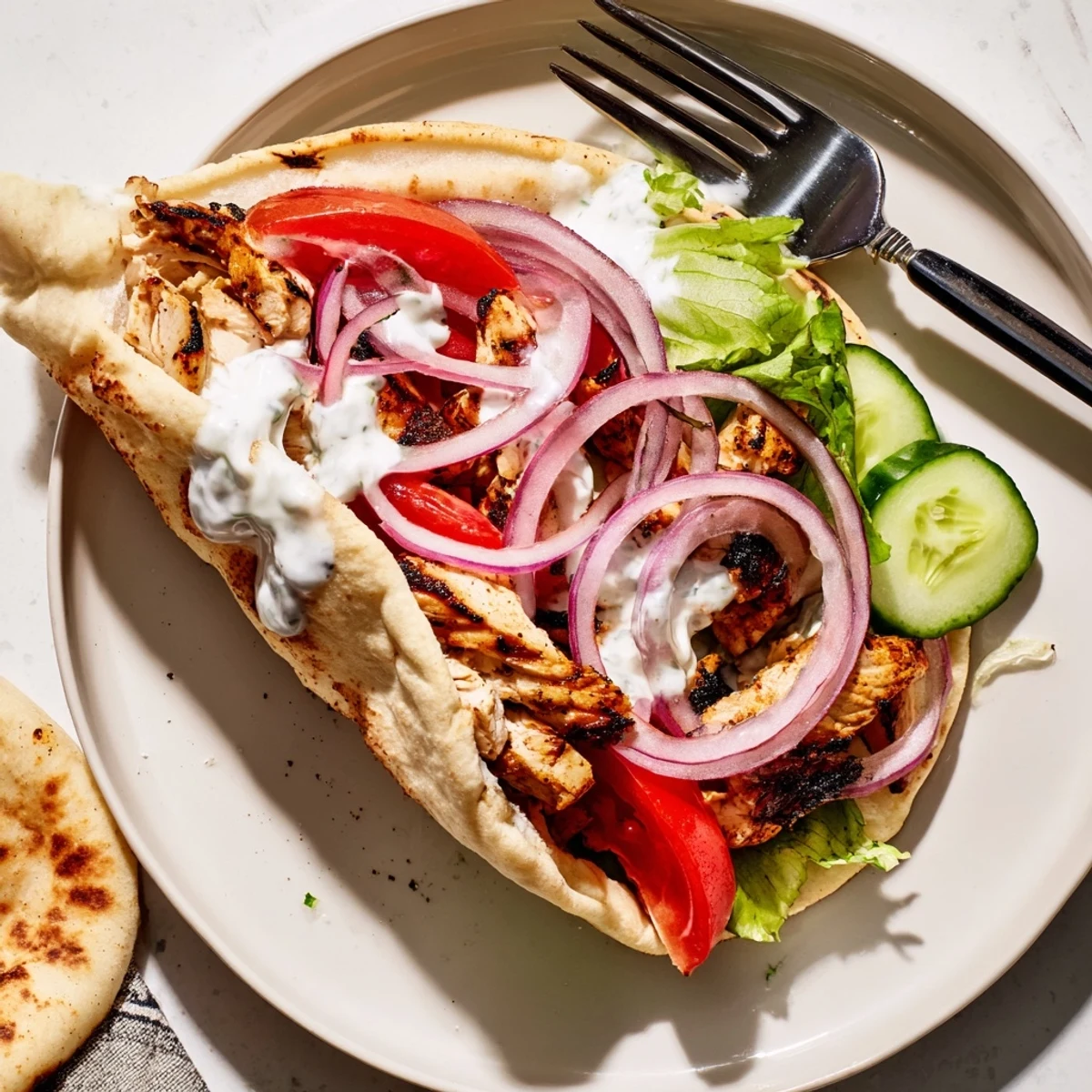 Savory chicken breasts marinated in olive oil, lemon juice, garlic, oregano, and aromatic spices, then grilled until beautifully charred and juicy. Sliced and tucked into soft, warm pita breads layered with crisp red onion, ripe tomatoes, refreshing cucumber, and shredded lettuce. Each generous portion gets crowned with cool, creamy tzatziki sauce blending Greek yogurt, grated cucumber, garlic, and fresh dill. Ready in under 20 minutes of active cooking time, though letting the meat marinate for an hour deepens the Mediterranean flavors wonderfully.