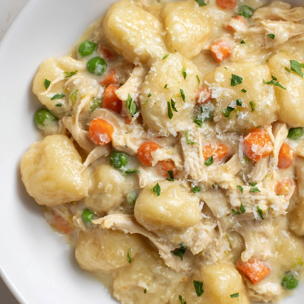 - Add uncooked gnocchi, shredded chicken, and frozen peas, stirring gently to ensure the gnocchi are submerged, then cover and simmer for 10 to 12 minutes, stirring occasionally, until gnocchi are tender and sauce has thickened beautifully