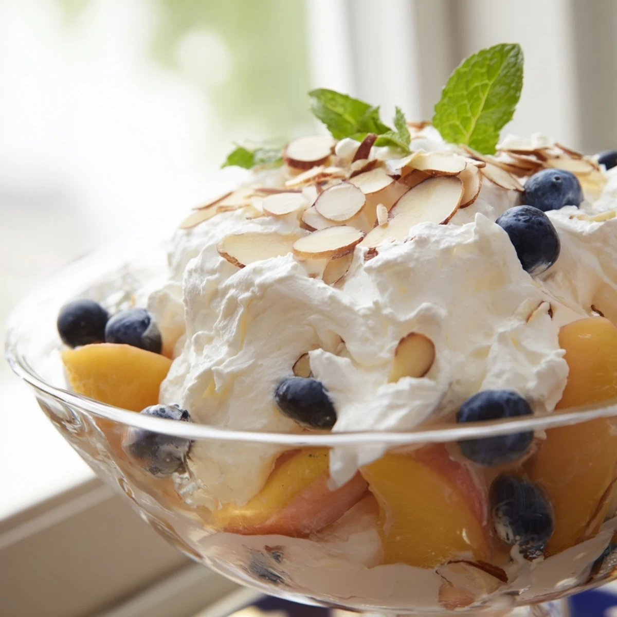 This refreshing chilled dessert combines ripe, juicy peaches with lightly sweetened whipped cream for a perfect summer treat. The natural sweetness of fresh peaches pairs beautifully with vanilla-scented cream, while fresh mint adds a bright, aromatic finish.