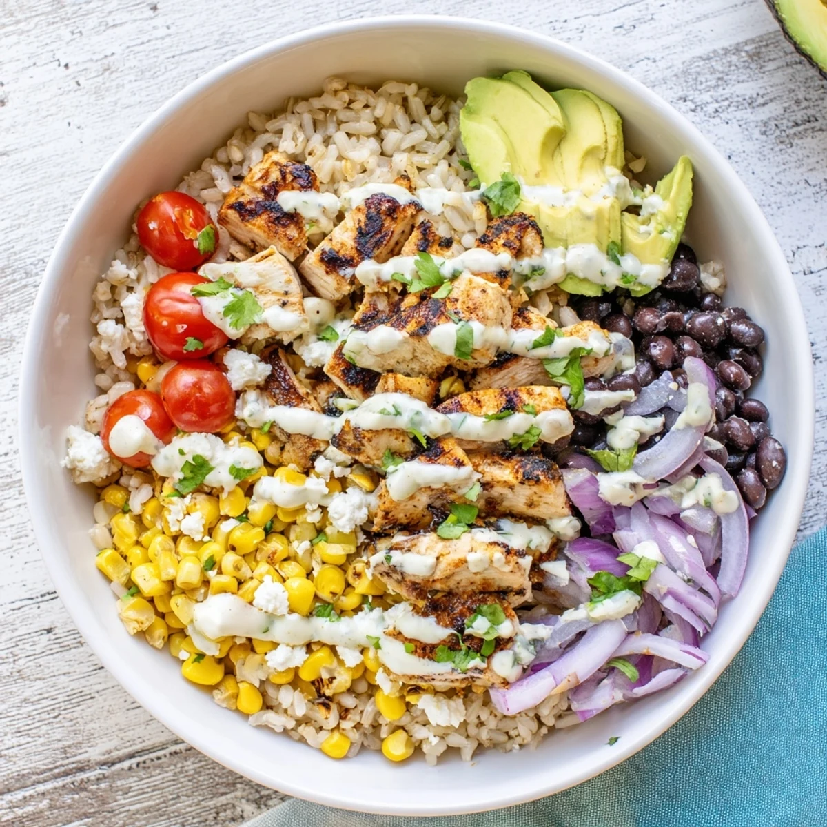 - Start with a base of rice or quinoa in each bowl, then arrange the black beans, street corn, cherry tomatoes, red onion, and avocado in sections. Slice the chicken against the grain and fan it on top.