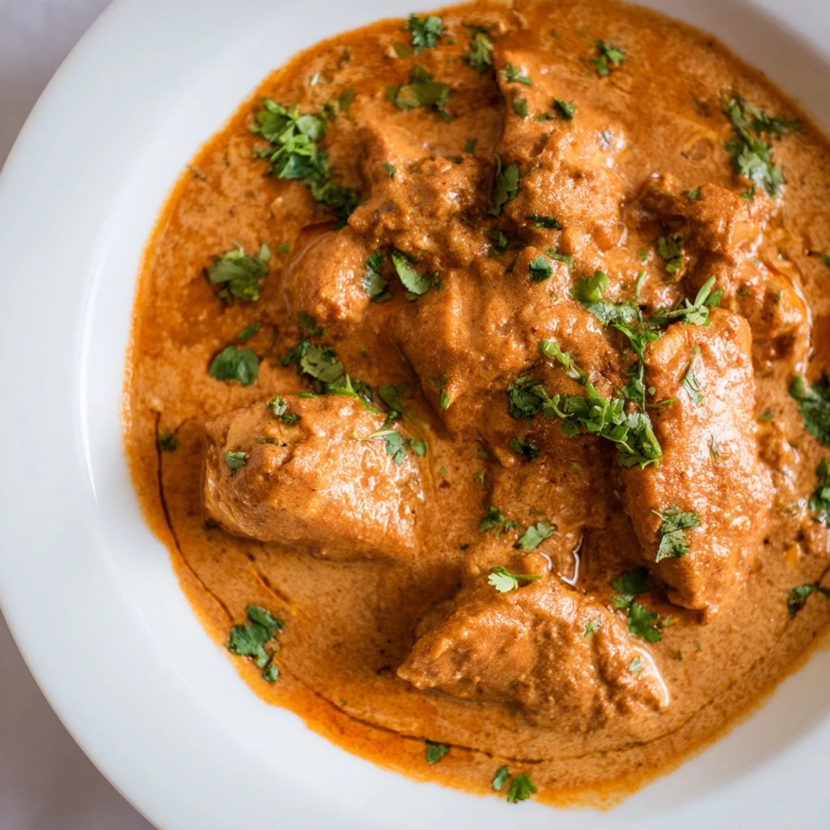 This dish features juicy chicken thighs marinated in yogurt and spices, cooked slowly in a tomato-based sauce infused with garam masala, turmeric, cumin, and coriander. The long, gentle cooking melds the flavors and creates a creamy, aromatic sauce finished with fresh cilantro. Perfect for effortless preparation, it offers a rich and satisfying Indian-inspired meal that pairs wonderfully with basmati rice or warm naan.