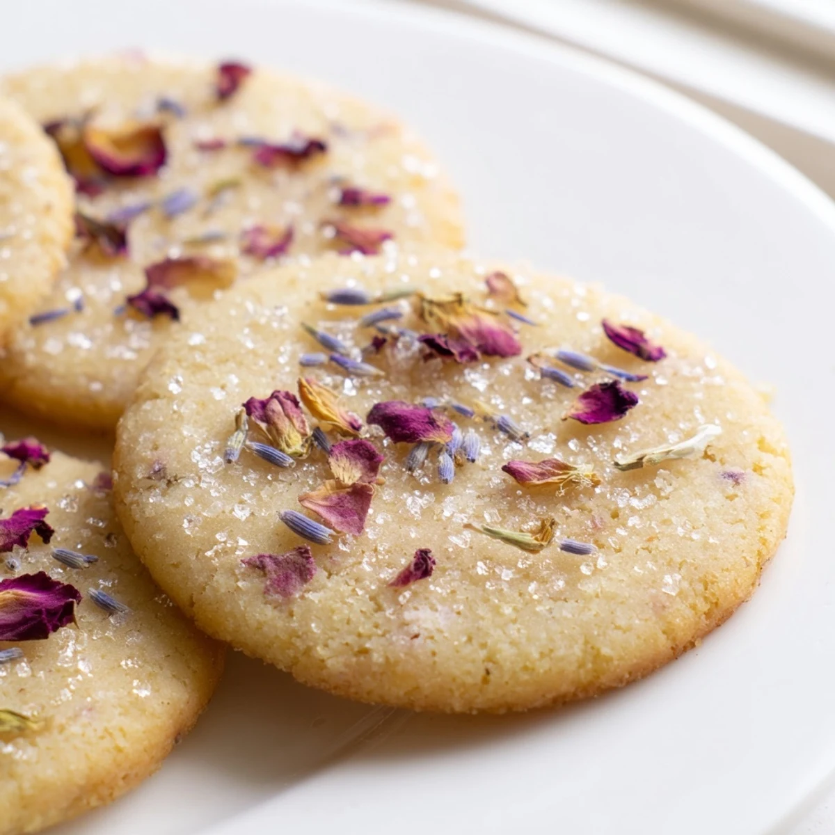 These delicate spring cookies feature a classic buttery base enhanced with vanilla and topped with dried edible blossoms like rose, lavender, or violets. The preparation comes together quickly with just 20 minutes of prep time, followed by 12 minutes in the oven until edges turn golden.