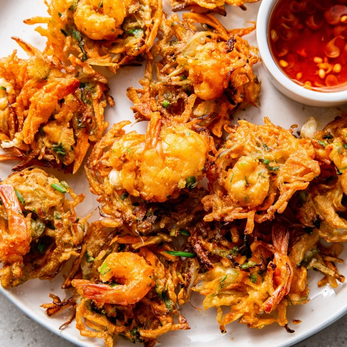 The secret lies in the cold water batter and the perfect mix of sweet potato, carrots, and bean sprouts. Each fritter fries up beautifully crisp while keeping the shrimp tender and sweet.