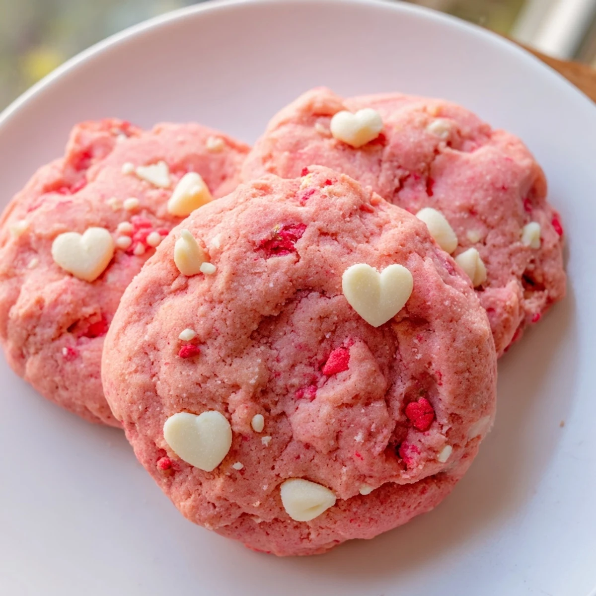 Create bakery-style soft cookies with vibrant pink color from freeze-dried strawberry powder and fresh fruit pieces. The combination of sweet white chocolate chips and natural strawberry flavor delivers a perfect Valentine's Day treat that's both visually stunning and delicious. Ready in just over 30 minutes, these cookies bake up with puffed centers and set edges for that ideal soft texture everyone loves.